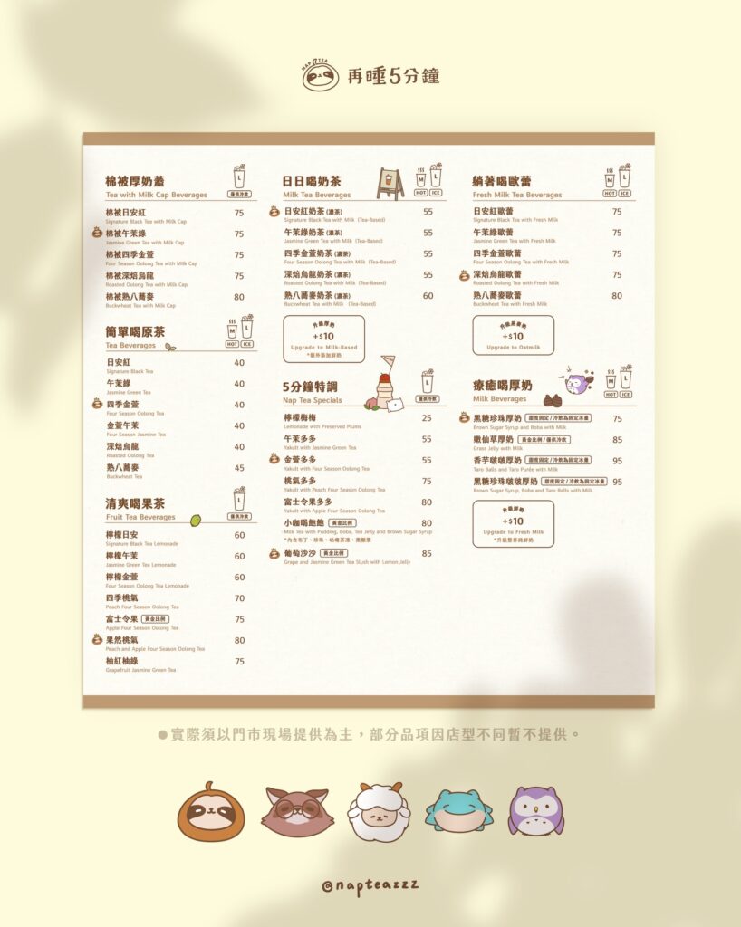 實際品項及價格以再睡五分鐘或現場門市為準。