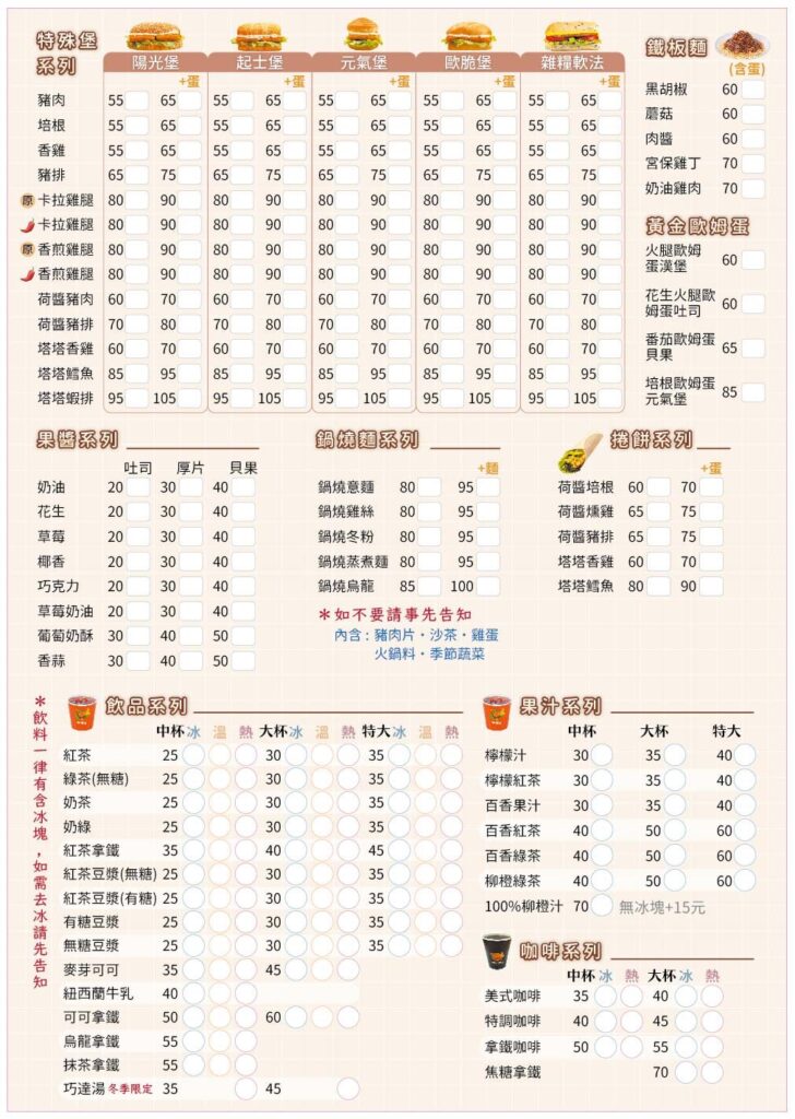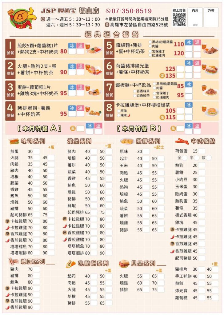 點擊瀏覽完整菜單內容 / 價位 ★★ 100-400元人均 圖片為個人統整僅供參考,版權歸呷尚寶JSP所有。 實際品項及價格以呷尚寶JSP官網或現場門市為準。 文章導覽 2024/2025 完整菜單 – 弘爺漢堡 Hong Ya Hamburger2024/2025 完整菜單 – 高雄老江紅茶牛奶 LAO CHIANG