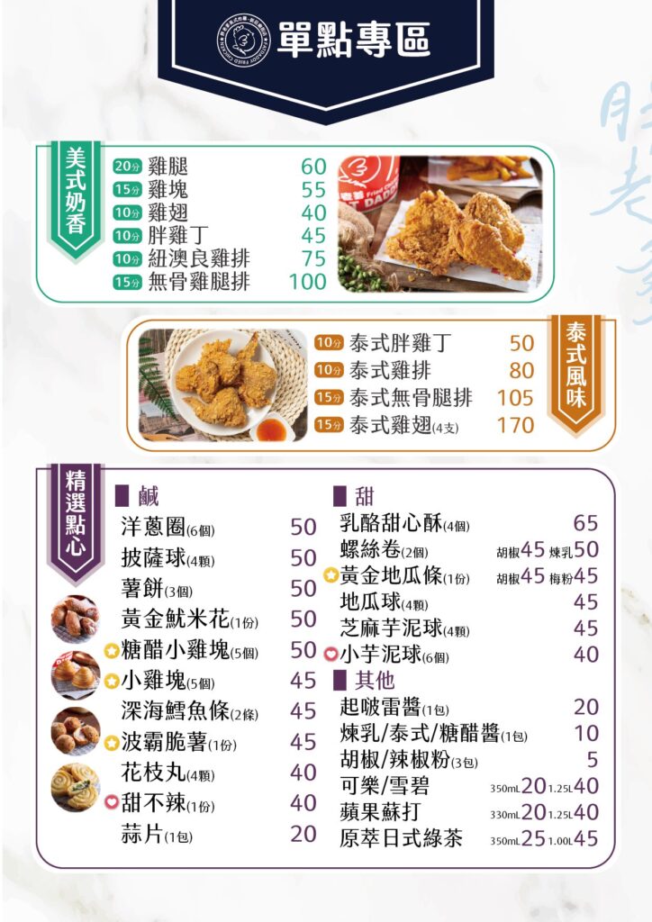 點擊瀏覽完整菜單內容 / 價位 ★★ 100-400元人均 注意! 現點現炸請務必電話預約 圖片為個人統整僅供參考,版權歸胖老爹所有。實際品項及價格以胖老爹或現場門市為準。 文章導覽 2024/2025 完整菜單 – 超派炸雞